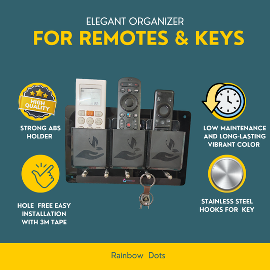 Rainbow Dots Remote & Key Organizer Wall Mount – 3 Remote Holders for TV, DTH & AC | 5 Key Hooks | Dual Color ABS on Acrylic Base | 3M Tape + Screws | Made in India