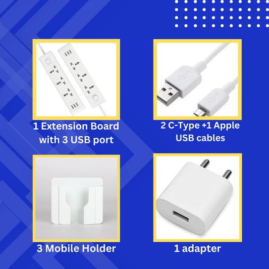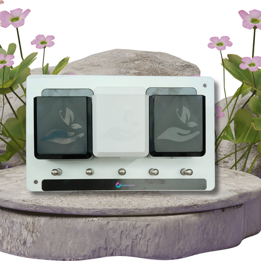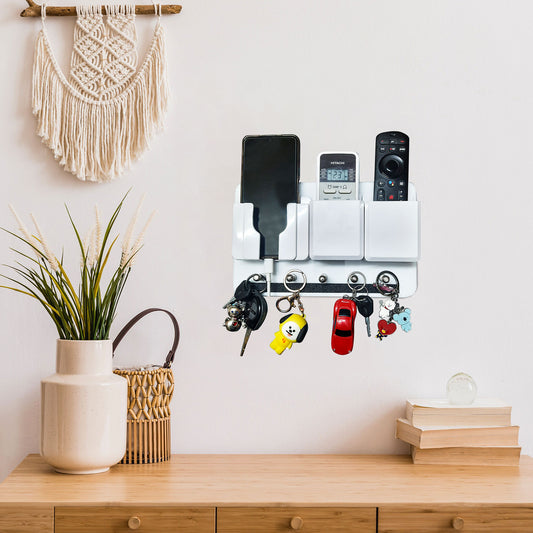 Made in India Wall Mounted Mobile Charging Holder & Key Organizer | Dual ABS Holders, 5 Stainless Steel Hooks, Acrylic Base | 3M Tape & Screws for Easy Installation